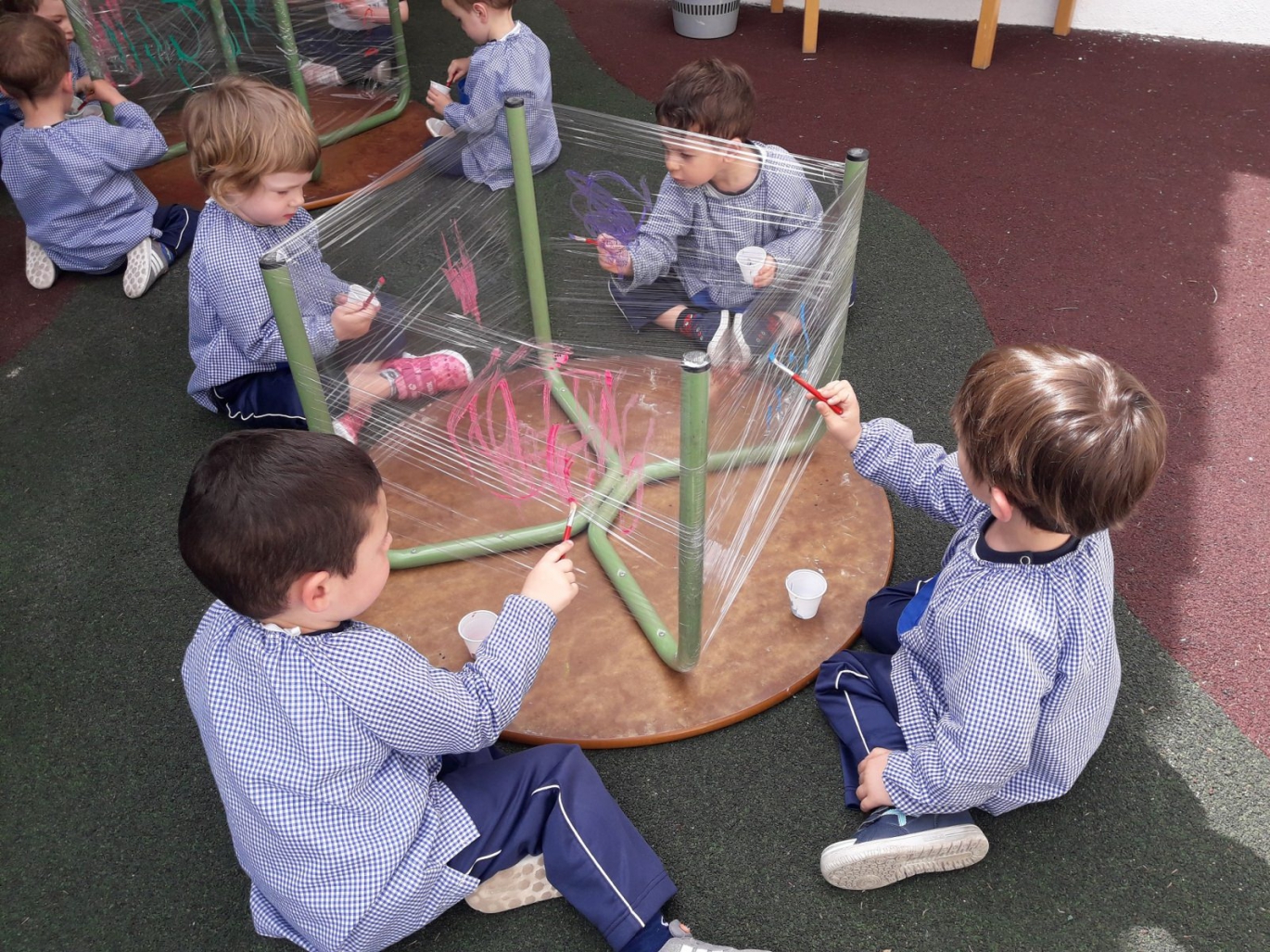 Los patios de la Escuela Infantil se convierten en espacios para la creación y la exploración durante el taller artístico. Los alumnos mezclan colores y trazan todo tipo de líneas y formas sobre plásticos transparentes que producen efectos visuales. Esta actividad estimula su creatividad e inventiva en un ambiente lúdico en el que cuentan con el acompañamiento de sus maestras.