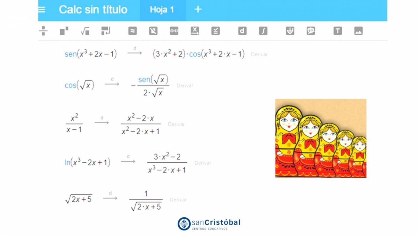 Dentro del marco de la neurodidáctica, en la asignatura de matemáticas de Bachillerato los alumnos y alumnas han aprendido a realizar paso a paso derivadas compuestas con la regla de la cadena a través de la metodología por analogía con un elemento visual, como han sido en este caso las matrioskas, que de una forma divertida nos han permitido conectar y relacionar por asociación de simbología la nueva información de este proceso matemático para hacer más comprensible aquello que, a priori, no lo es tanto.