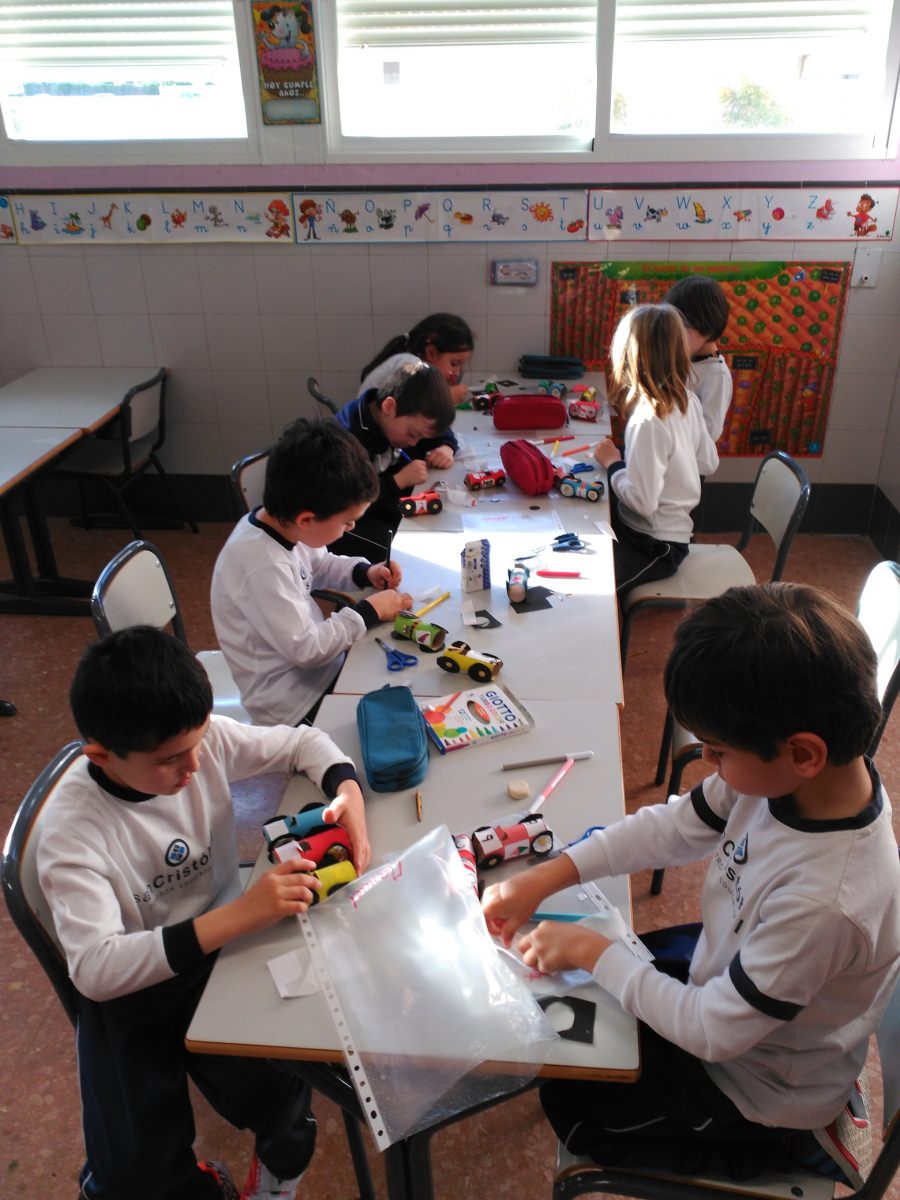 Los alumnos de 1º y 2º de Primaria participantes en el Taller de artística se han divertido creando coches de juguete con materiales reciclados. Esta actividad estimula su creatividad y les conciencia sobre la conservación del medio ambiente dentro del Programa de desarrollo de las Inteligencias Múltiples.