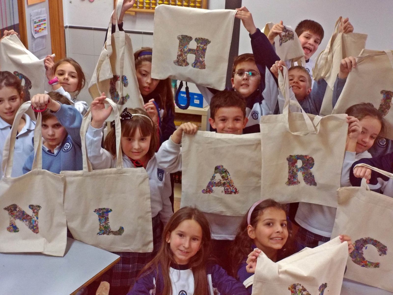 Los alumnos del taller de moda de 3º y 4º de Primaria han decorado una bolsa con ceras. Esta actividad desarrolla la creatividad y la imaginación gracias al uso de materiales que para ellos son cotidianos.