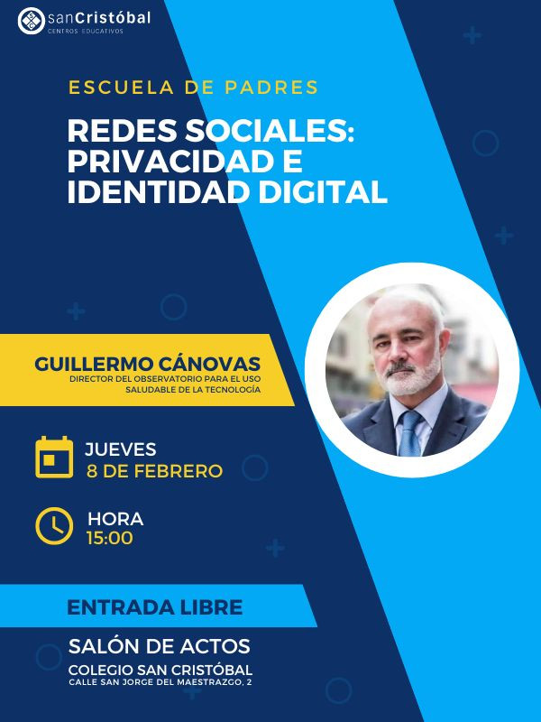 El Colegio San Cristóbal anuncia una nueva edición de la Escuela de Familias: la conferencia "Redes Sociales: Privacidad e Identidad Digital", impartida por el reconocido experto Guillermo Cánovas. Este evento, se llevará a cabo el jueves 8 de febrero a las 15:00 horas en el salón de actos del centro (Calle San Jorge del Maestrazgo, 2).