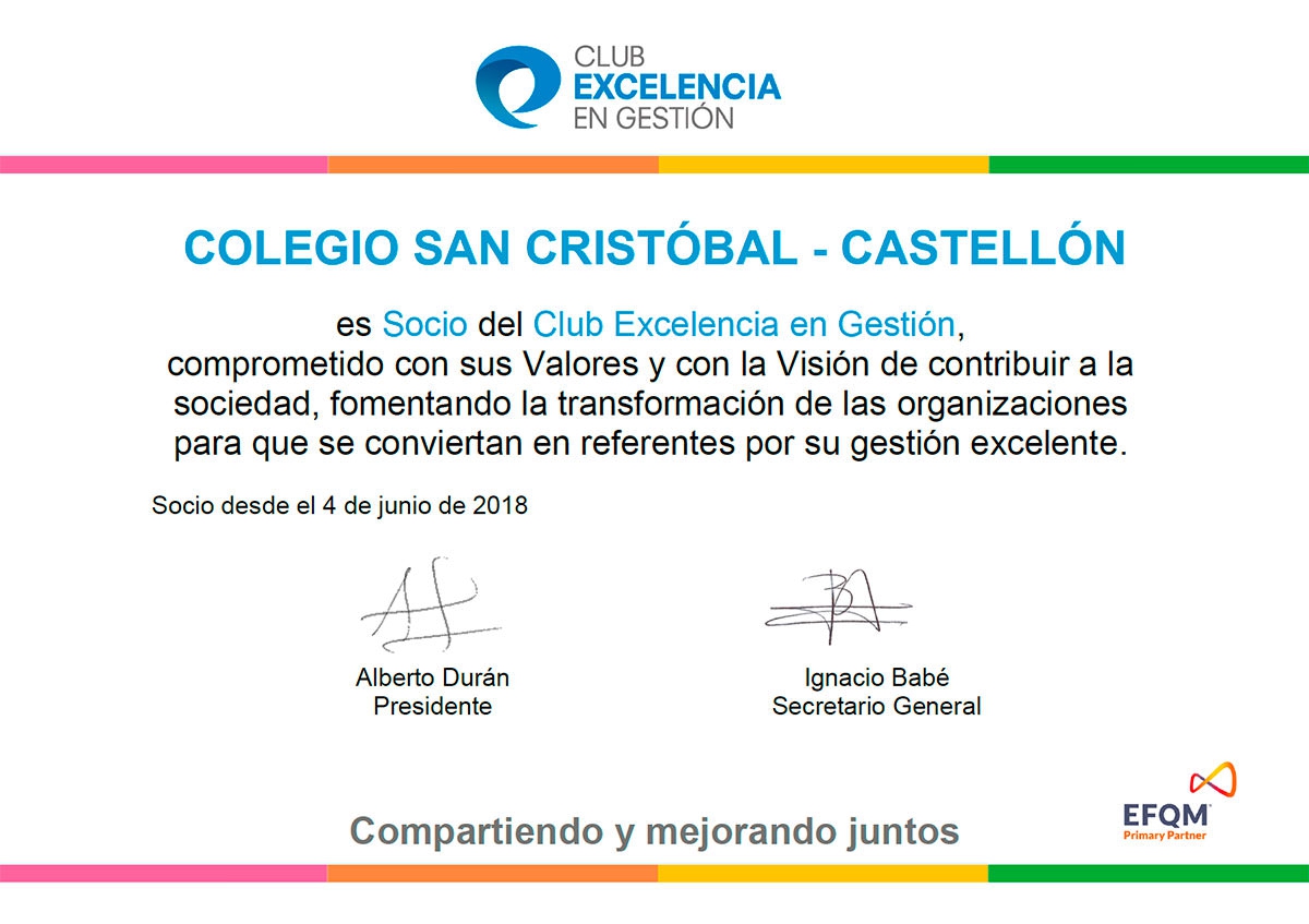El Colegio San Cristóbal ha entrado a formar parte del Club Excelencia en Gestión, en una apuesta clara por identificarnos aún más con la excelencia y la innovación como aspiración fundamental y eje de nuestras actuaciones. Empresas de todos los tamaños y sectores forman parte de esta organización con 27 años de historia.