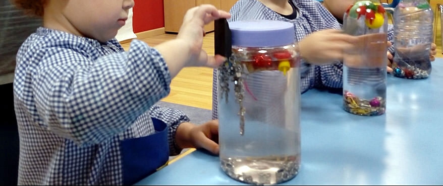 Los alumnos de 2 años de la Escuela Infantil han podido observar el fenómeno de atracción y repulsión que se da cuando se juntan dos imanes. Los niños han pasado un imán por diferentes botellas a la vez que han realizado juegos de movimiento: arriba y abajo, círculos, a la izquierda y a la derecha. Han comprobado la fuerza y atracción de los imanes, a la vez que se han divertido.
