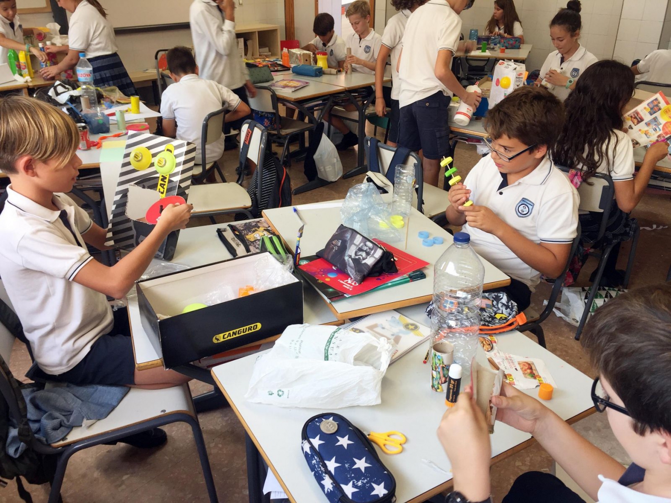 Los alumnos de 6º de Primaria están realizando esculturas a partir de materiales reciclables. Para ello usan rollos de papel higiénico, cajas de zapatos, tapones de botellas de plástico o envases de cereales, entre otros objetos. La actividad forma parte de la asignatura de Programa de Activación de Inteligencias Múltiples (PAIM) y pretende fomentar la creatividad entre los niños y niñas.