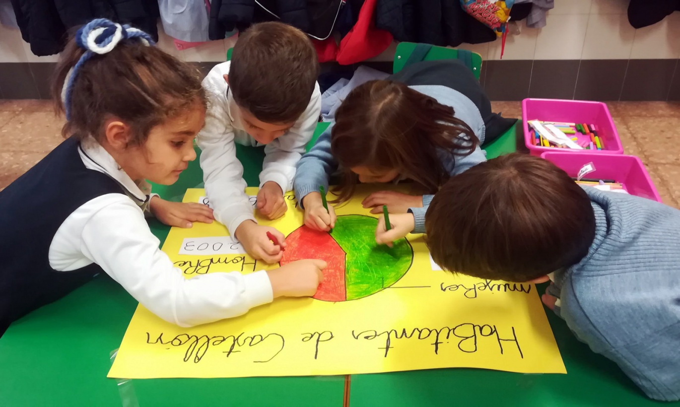 Los alumnos de Infantil 5 años han elaborado un gráfico estadístico sobre el número de habitantes existentes en la ciudad de Castellón. Previamente, con la ayuda de los profesores, han recopilado información sobre la distribución de la población entre hombres y mujeres. De esta manera han trabajado la inteligencia matemática.