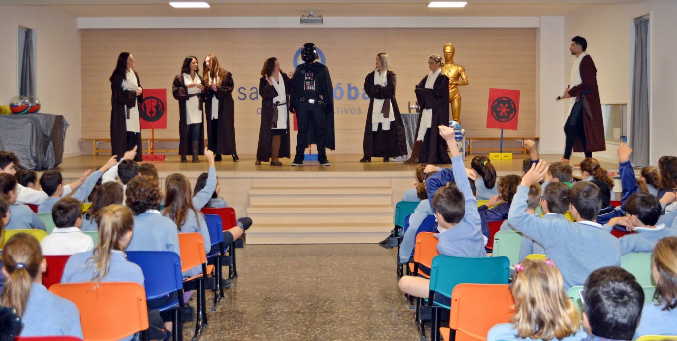 Por último, los alumnos de 5º y 6º de Primaria realizan el proyecto de comprensión '¡Que la fuerza te acompañe!', basado en la saga cinematográfica 'Star Wars'. Aprenden la diferencia entre planeta, satélite, cometa, asteroide y estrella, así como los requisitos que debe tener un cuerpo celeste para ser considerado planeta, cómo afecta la fuerza de la gravedad a los objetos, qué tipos de fuerza hay en nuestro planeta, quién era Charles Darwin, en qué consiste la teoría de la evolución de las especies y, por último, la diferencia entre los actuales drones y los de 'Star Wars'. El objetivo académico es que los escolares identifiquen las características principales del sistema solar, desarrollen su creatividad artística, aprendan a utilizar Internet para buscar información, conozcan a Charles Darwin, aprendan a resolver acertijos y disfruten de la saga 'Star Wars'. De hecho, los profesores han realizado un pequeño espectáculo sobre 'Star Wars' disfrazados de los personajes.