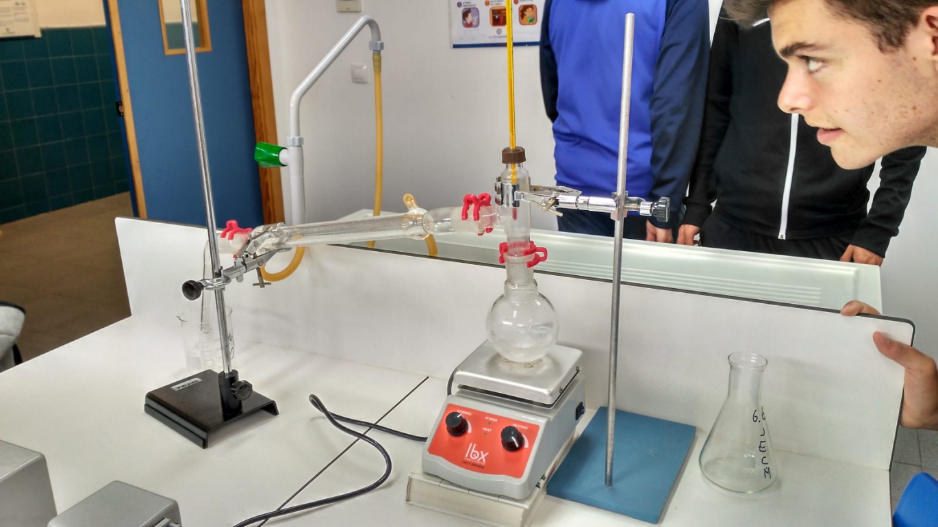 Los alumnos de 1° de Bachillerato han realizado en el taller de ciencias la síntesis de ácido acético salicílico (aspirina) y una destilación para separar una mezcla de dos líquidos miscibles.