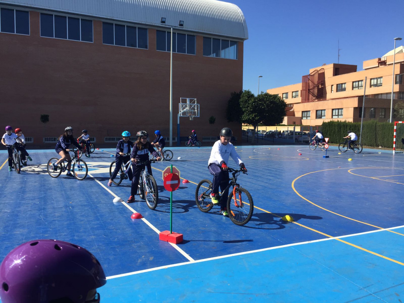 Los alumnos de 5º de Primaria han aprendido las normas básicas de seguridad vial en sus clases de Educación Física, donde montados sobre sus bicicletas han realizado un simulacro de recorrido por vía urbana en el que debían respetar las señales de circulación.