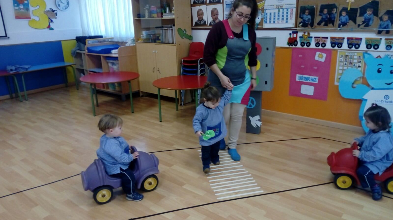 Los alumnos de la Escuela Infantil aprenden las normas básica de seguridad vial durante el desarrollo del proyecto "La calle", donde su aula se ha transformado en una vía pública con semáforos, pasos de peatones y vehículos.