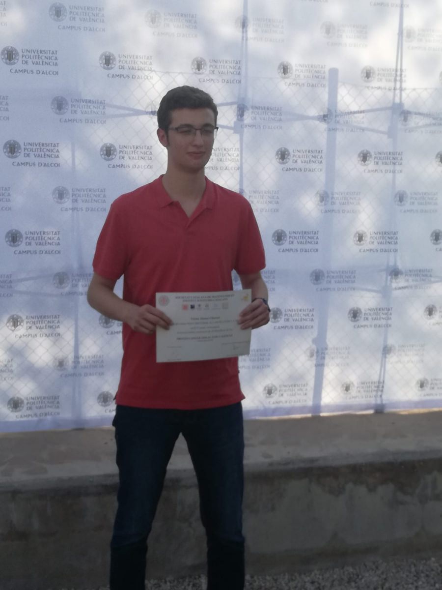 Víctor Alonso, alumno de 2º de Bachillerato, ha obtenido el tercer puesto en la Prova Cangur 2018 de matemáticas entre un total de 704 participantes en su categoría del nivel 6. La entrega de premios se celebró en el Salón de Grados Roberto García Payá del Campus de Alcoy de la Universitat Politècnica de València UPV.